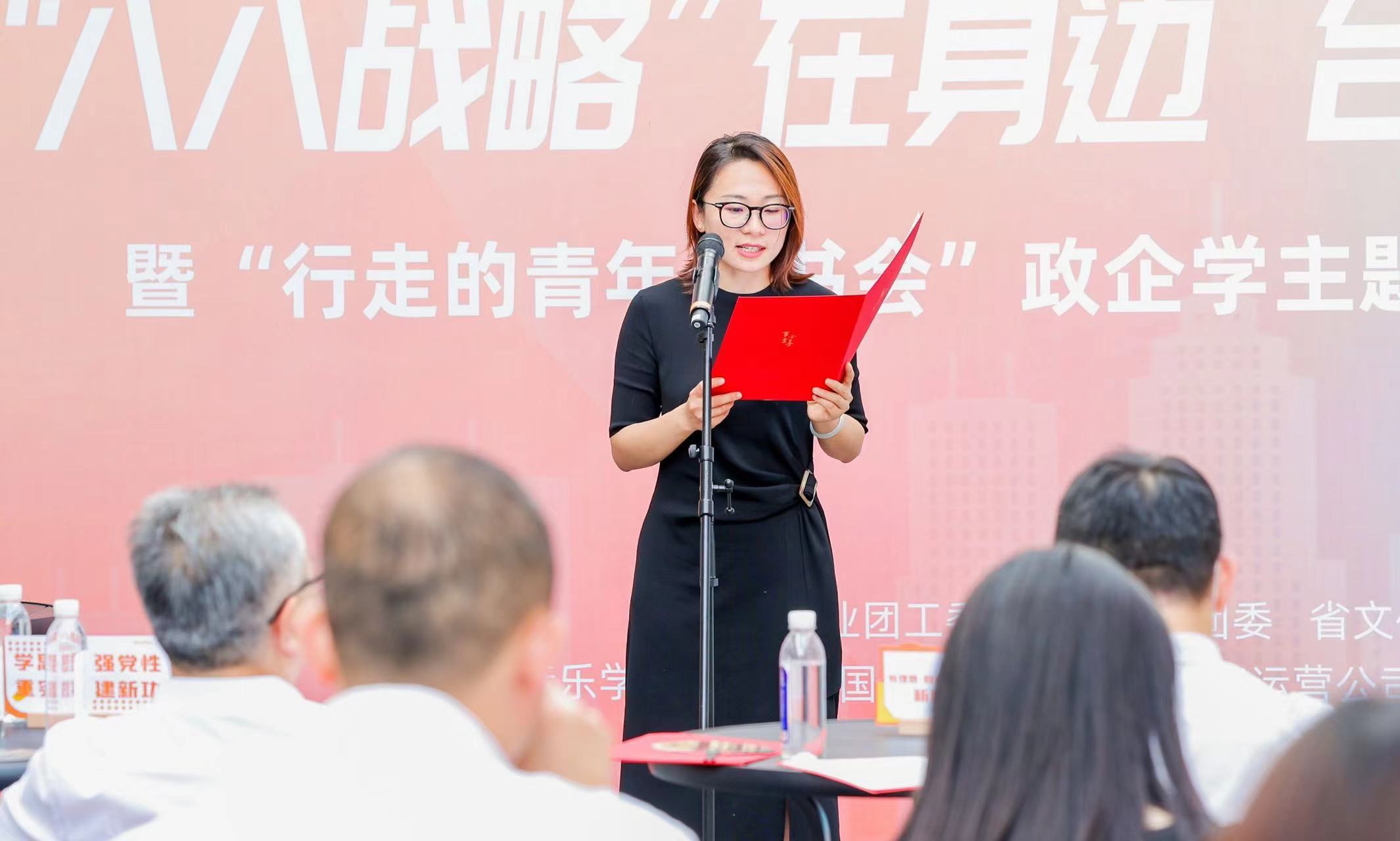 图为“浙企青音”浙江国企青年理论宣讲团成员、省国有资本运营有限公司所属发展资产公司胡竞向大家分享浙江国企在奋进“两个先行”的赛道上唯实惟先,善做善成的生动实践。 中国青年网通讯员 傅璇 供图